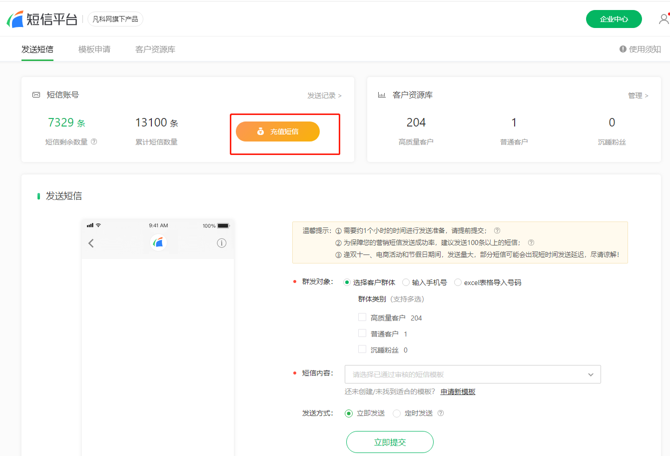 但需要留意短信剩余量。(点击“购买短信包”,可前往直接进入凡科短信平台购买短信包。)