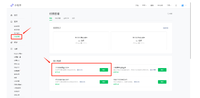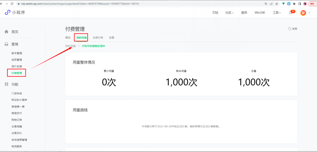 3、每次验证微信手机号将收取0.03元,可前往“小程序MP后台-管理-付费管理-我的用量”中查看余量及充值。