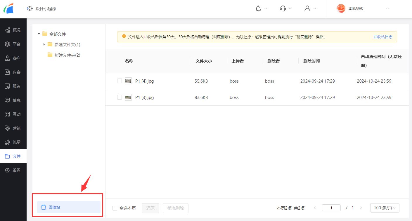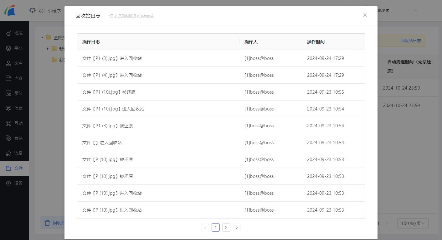 配套回收站日志,可以查看文件素材删除、还原的操作记录。