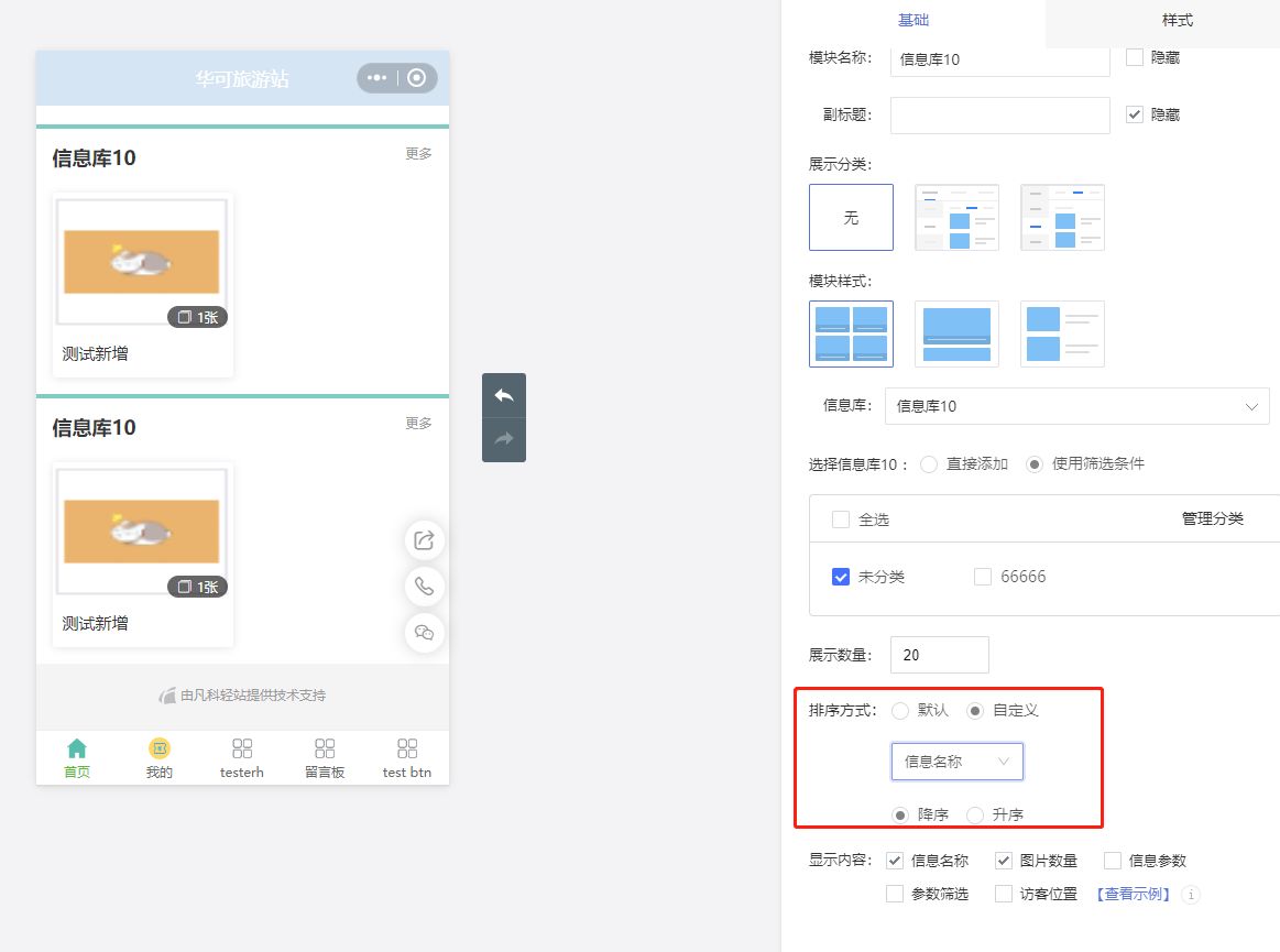 2、可根据信息名称、时间,以及信息开启的功能(访客位置、参数)做升序或降序的排序。