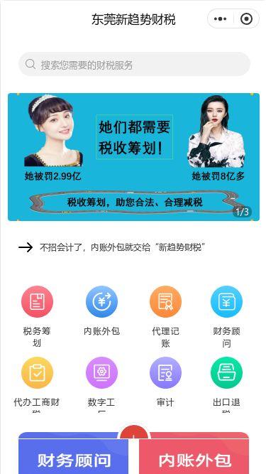 一一我们来看看老张公司用凡科轻站制作出来的小程序。一打开小程序,首页就非常醒目。顶部是滚动的宣传图,展示了一些税收筹划的案例,比如“她被罚款2.99亿”“她被罚8亿多”,一下子就抓住了用户的眼球,毕竟谁都不想因为税收问题而遭受这么大的损失呀。下面是各种业务的快捷入口,像税务筹划、内账外包、代理记账、财务顾问等等,用户想了解哪项业务,轻轻一点就可以进去。
