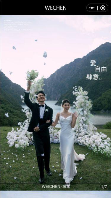 一一一打开这个小程序,映入眼帘的就是一对新人在美丽的自然风景中,男士穿着笔挺的西装,女士身着洁白的婚纱,画面简直不要太美,那种幸福的氛围一下子就扑面而来了。上面写着“爱,自由,肆意”,这几个字一下子就把那种浪漫的感觉烘托出来了。
