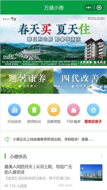 一一还有“小德快讯”板块,会发布一些跟房产相关的文章,像“最美人间四月天 | 云河上院,写给广元的人居史诗”“万盛高德旗下房产服务小程序‘万盛小德’正式上线”等等。这些文章不仅能增加小程序的内容丰富度,还能吸引用户阅读,提高用户的停留时间。