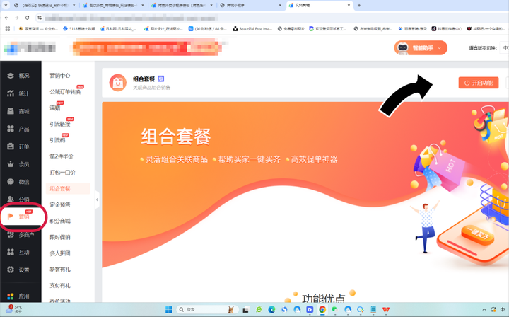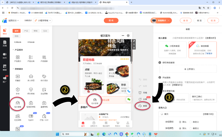 促销要醒目: 在左边“营销”那堆工具里,我看到有个「组合套餐」,直接按住拖到主页上。设置了个“酸辣粉+冰豆浆=24.9元”的组合,比单点便宜5块,立马显眼包上线!