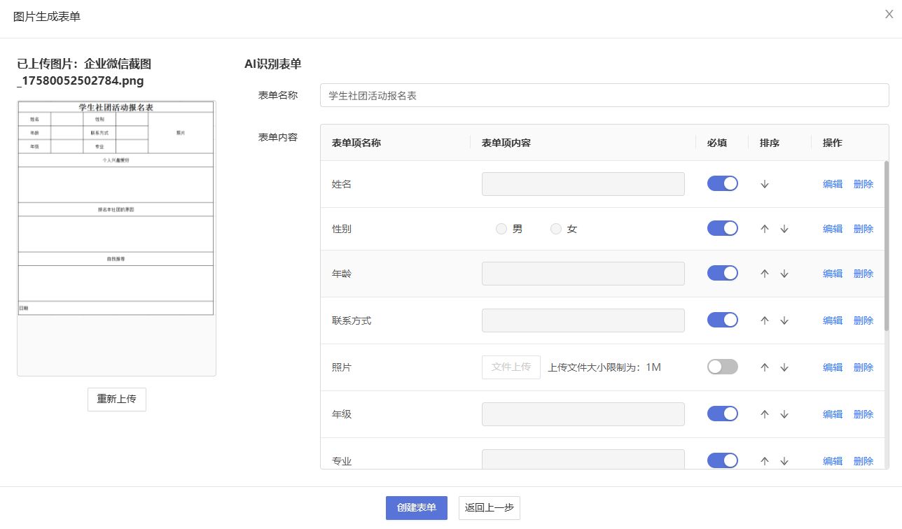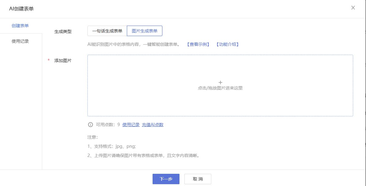 3、上传带有表格或表单的图片可创建表单。可拖动图片,点击下一步创建表单。AI 将识别并转化图片为对应内容表单。