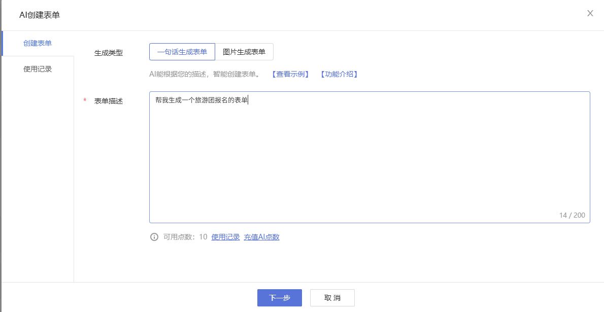 4、付费版本赠送10个AI点数,可创建10个表单(每个表单消耗1个点数)。若点数剩余不足,可充值AI点数。