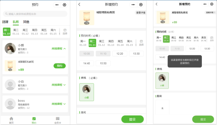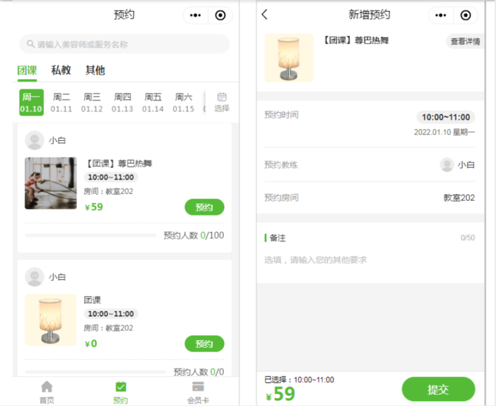 会员可以通过你的小程序,自主预约团课、私教课或其他类型的课程。