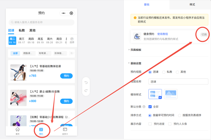进入小程序后台的“店铺装修” → 找到预约板块 → 点击“切换” → 选择“健身预约”模板 → 确认使用。
