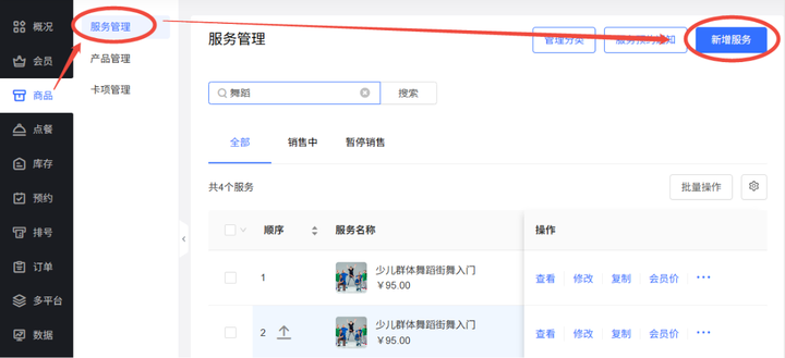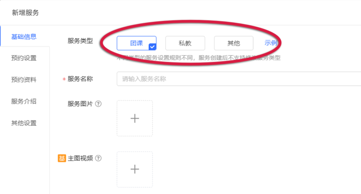 在“服务管理”中新建课程,选择类型:【团课】、【私教】或【其他】。