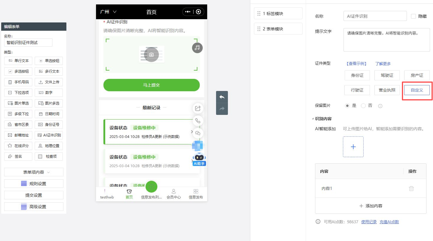 1、表单新增AI证件识别。可方便用户填表时,直接手机拍照上传证件图片,AI智能识别并填写内容,无需手工输入。