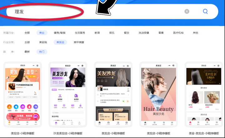 2.进到平台的小程序模板库,在搜索框直接搜“理发店”、“美发”、“发型设计“。