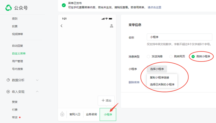 1.如果你有公众号,可以在发布的文章里巧妙推荐你的小程序,或在公众号菜单栏直接设置入口,引导你的粉丝一键进店下单。