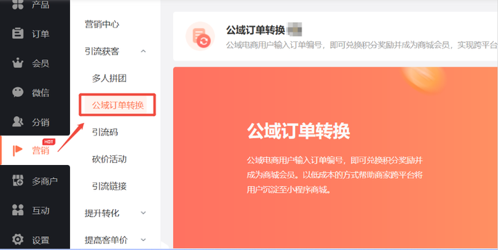 登录小程序制作平台的后台 → 依次进入【营销】-【公域订单转换】→ 找到【公域订单转换】功能,点“开启”。