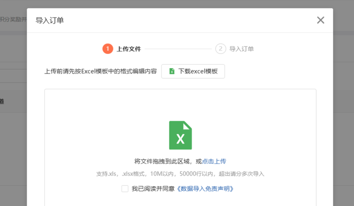 - 填完后上传文件,一次最多传5万条订单数据。