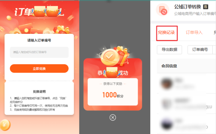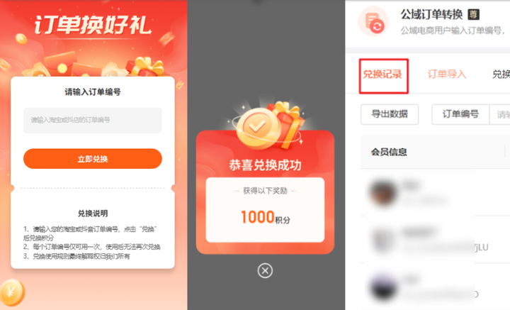 简单说,这个功能就是让在淘、京、抖这些平台买过你东西的顾客,在你的小程序里输入之前订单的编号,就能兑换积分,同时变成你小程序的会员。