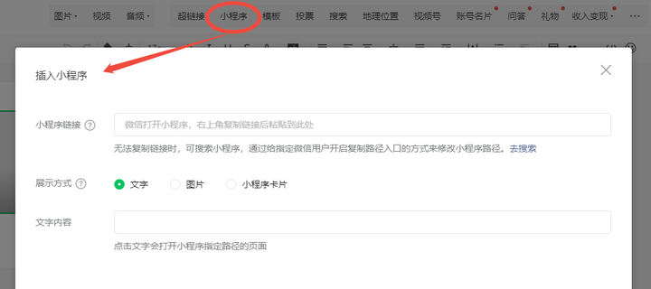 ③ 写推文时,在图文编辑页插入小程序卡片,方便用户点击跳转