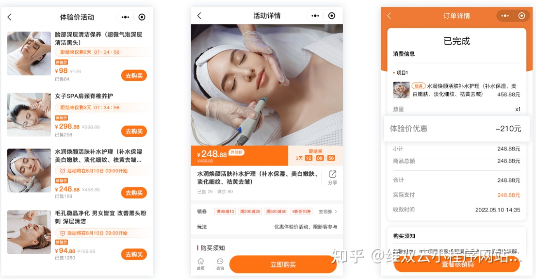 小程序里会显示体验价和原价的对比、优惠金额,还有活动倒计时,顾客看得明明白白。