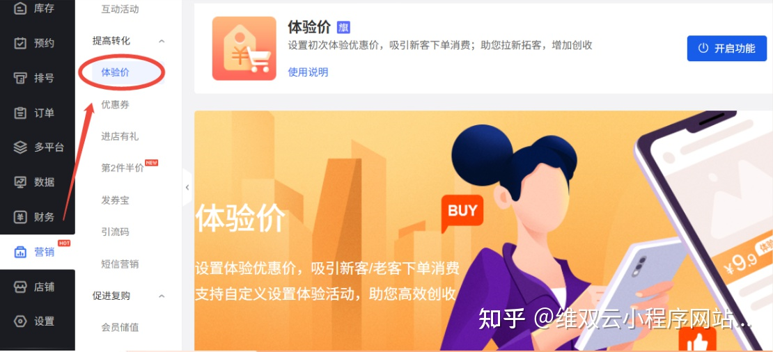 登录小程序门店后台 → 找到【营销】入口点进去 → 找到【体验价营销】选项 , 先把功能开关打开