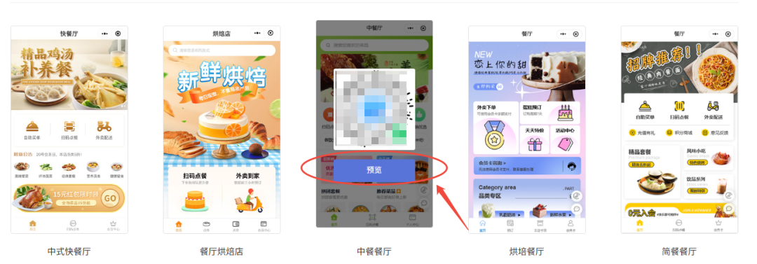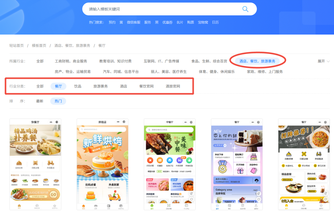 小程序模板库里有餐饮大类,也有分饮品店、餐厅、火锅店这些细分行业类型,这些模板都可以点击预览看做出来在手机上大概是啥效果。