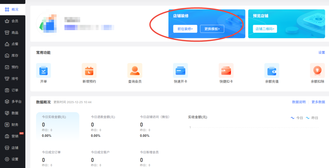 新用户注册登录后,会先来到一个叫“用户中心”的地方,这同时也是你之后管理小程序的后台,在右上角【店铺装修】,可以找到你刚才选中的那个模板。