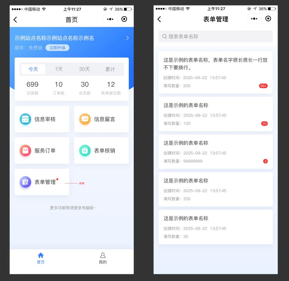 商家管理端新增了表单管理,支持在小程序上查看创建的表单、表单已提交的记录,以及对表单记录、表单状态、表单备注的修改。