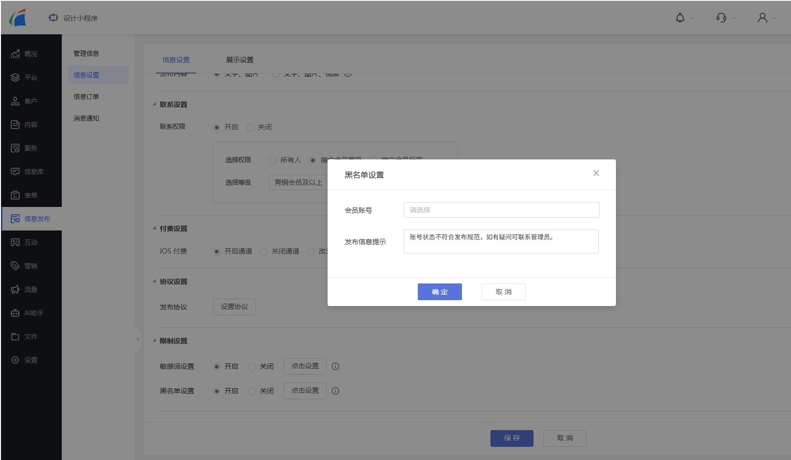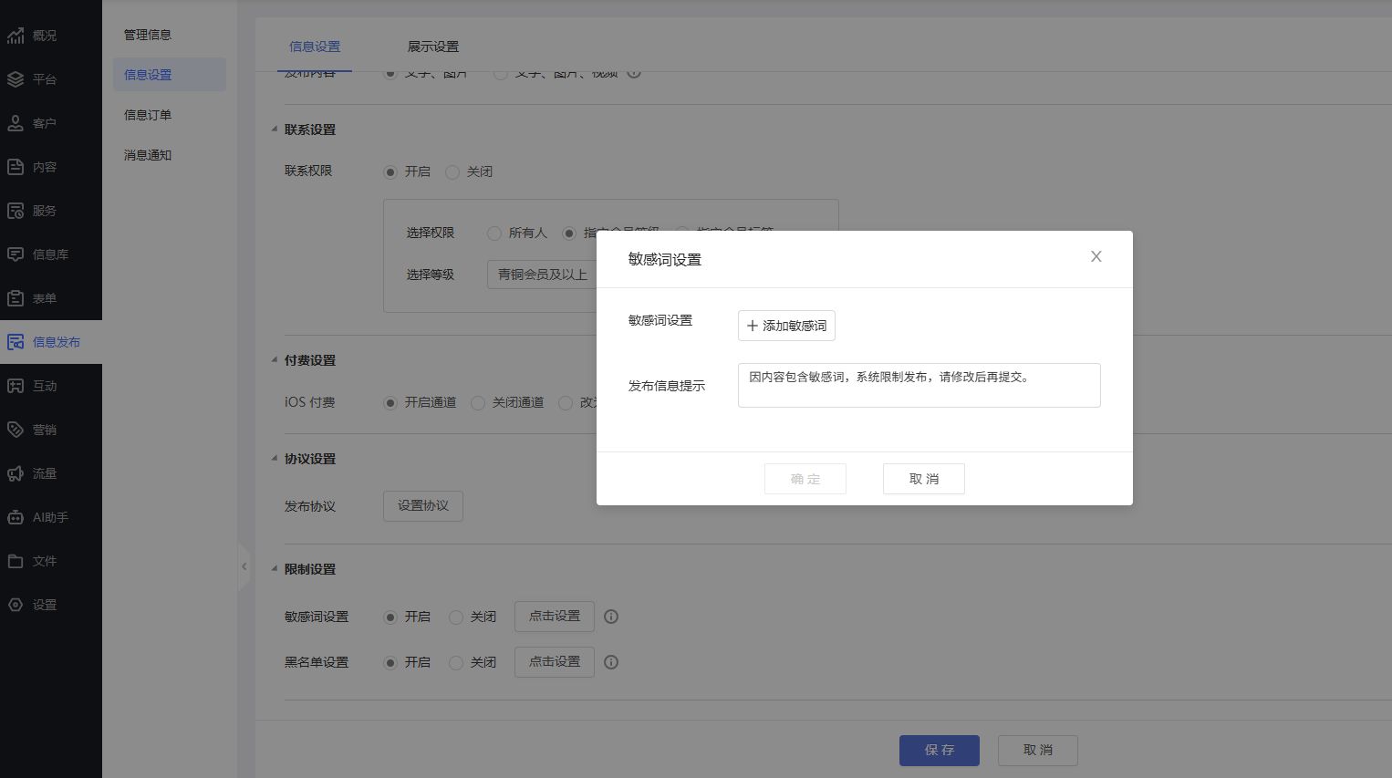 信息发布系统支持设置限制,包括敏感词限制、黑名单。