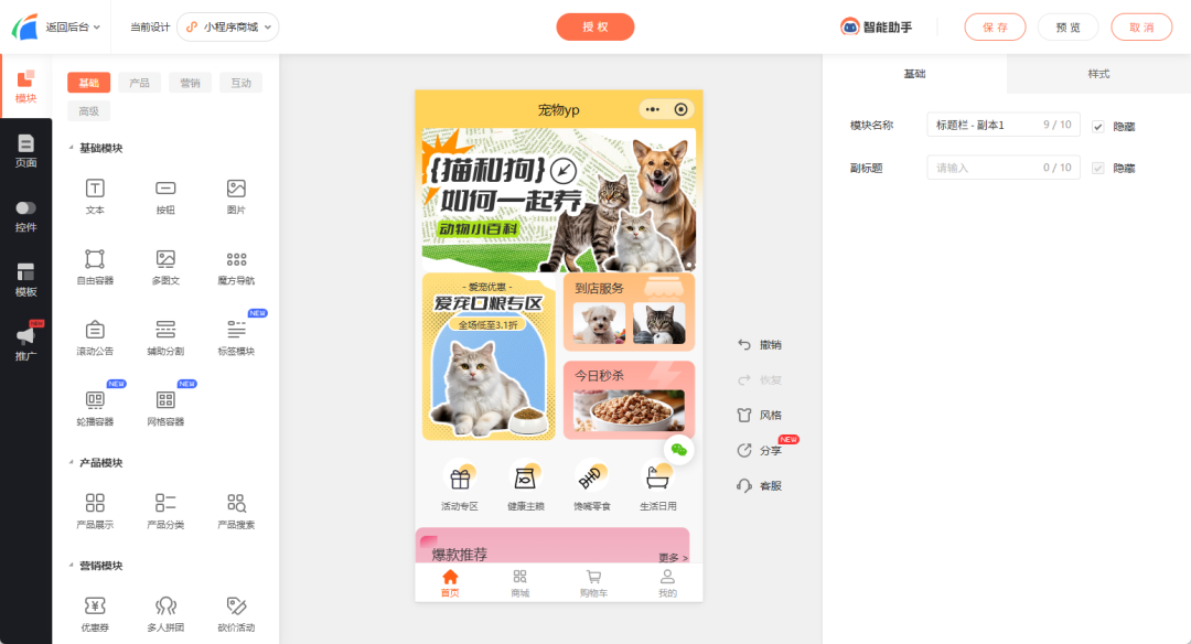 进入【装修】页面,点击上方的小程序审核发布/授权。即可提交到微信审核,等待微信官方审核,审核时间概为几个小时到2天。