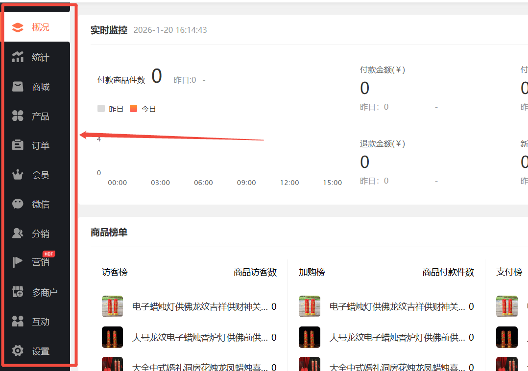 商家后台:商品与订单管理、用户数据与资产、营销活动、经营数据分析。