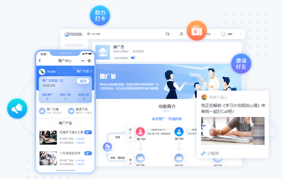 通过微信好友、群聊、朋友圈一键分享,可以快速、立体地展示机构实力、师资团队、课程体系与学员成果,小程序自身也有招生宣传的功能模块。
