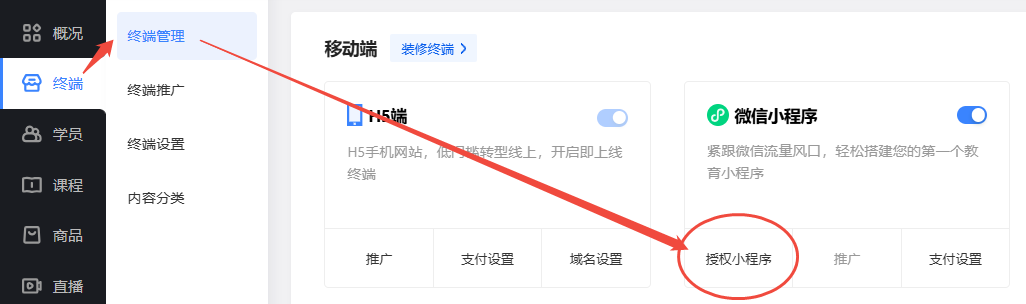 在后台点击【终端】-【微信小程序】-【授权小程序】-【注册小程序账号】,然后按要求完成小程序入驻微信端的几个步骤包括微信账号注册和备案。