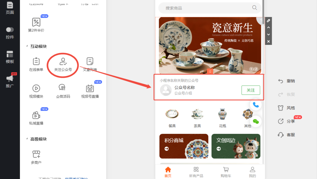 按照第一步的小程序教程,把小程序成功上线以后,返回小程序设计页面,在左侧功能栏找到【关注公众号】,然后把它拖到中间的小程序模板里,再填写下信息,保存即可。