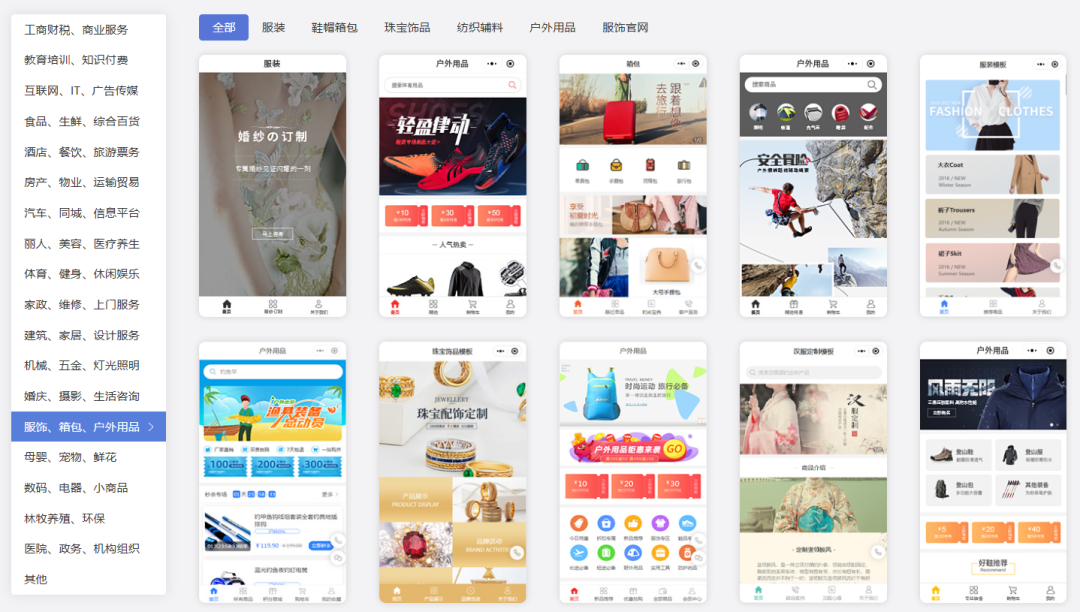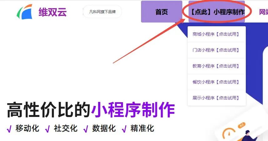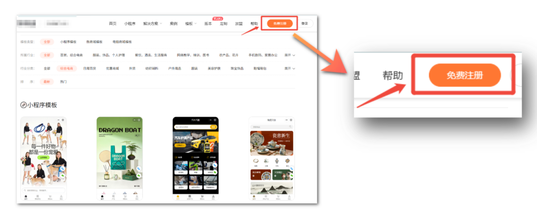 进入官网后,首页上通常有醒目的入口,找到【点此】小程序制作,选一个类型点进去,你就能看见我们的小程序模板库啦!