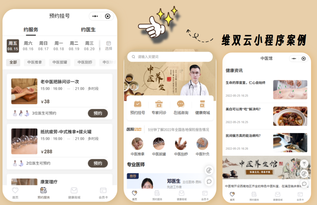 医馆预约挂号:用户关注后点击“预约服务”-“预约挂号”,选择科室、医生和时段,填写信息后完成支付。