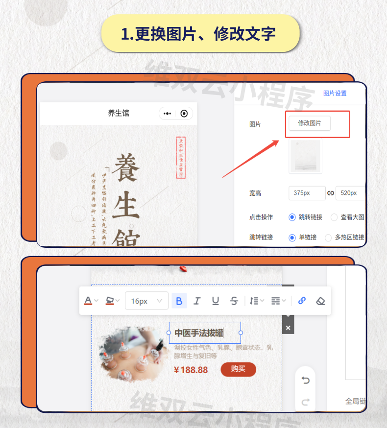 改文字和图片:把模板里的示例内容,全部换成你自己店铺的真实信息,比如店名、logo、服务项目介绍、环境照片等。