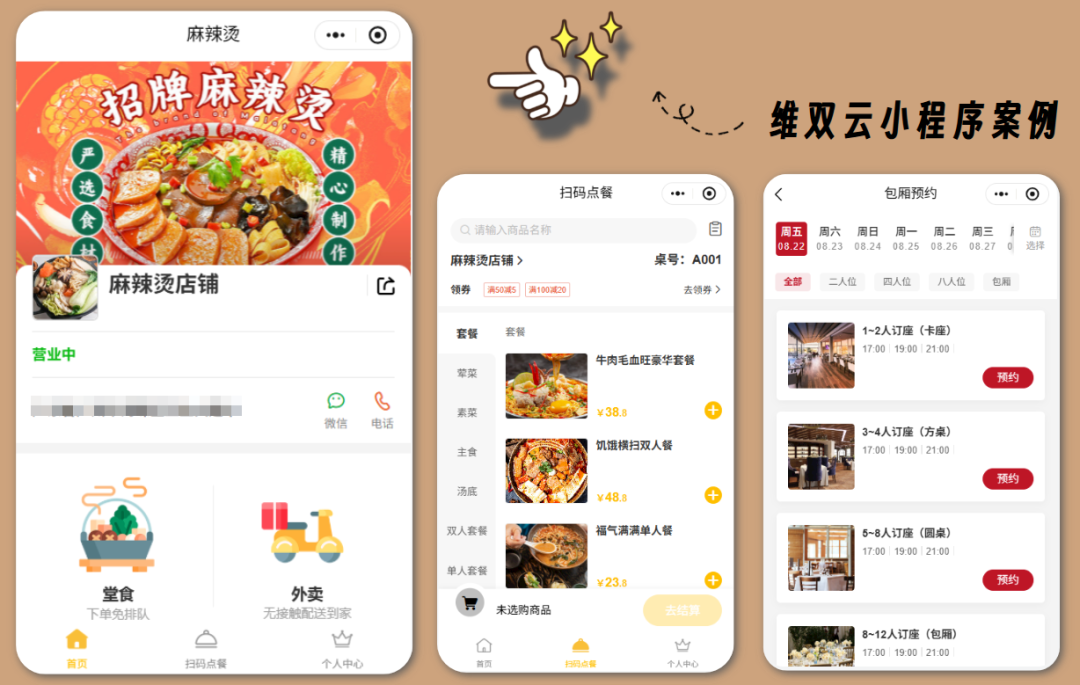 餐厅在线订座:餐饮品牌通过公众号小程序实现桌位预订,顾客可选择就餐时间、人数、包间类型,提前点餐并支付定金,到店后直接入座用餐。