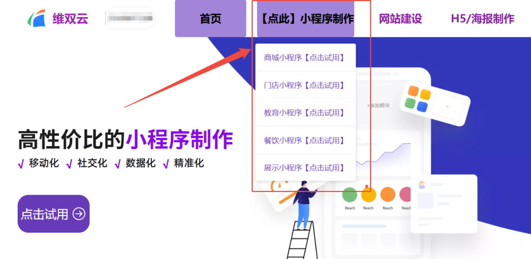 直接浏览器搜索“维双云”进入官网。先找到【小程序制作】的入口,然后根据你的核心业务,选择一个最接近的行业模板类型,比如“门店小程序”、“教育小程序”或“餐饮小程序”。选对模板,后续改起来能省一半力气。