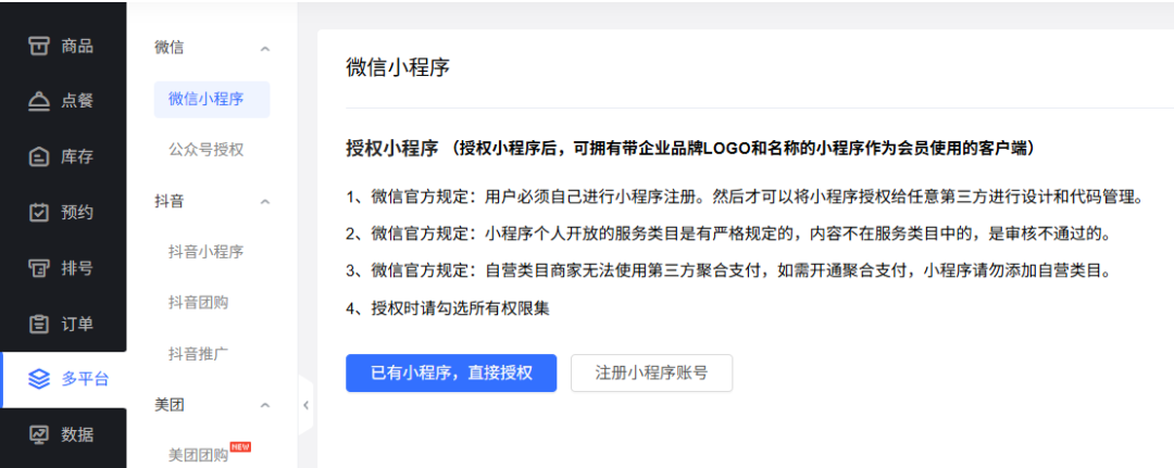 微信授权:在后台找到【微信】-【小程序】-【去授权】,按照指引,用你的小程序管理员微信扫码,完成授权绑定。(如果你还没有微信小程序账号,平台通常会引导你快速注册一个)。