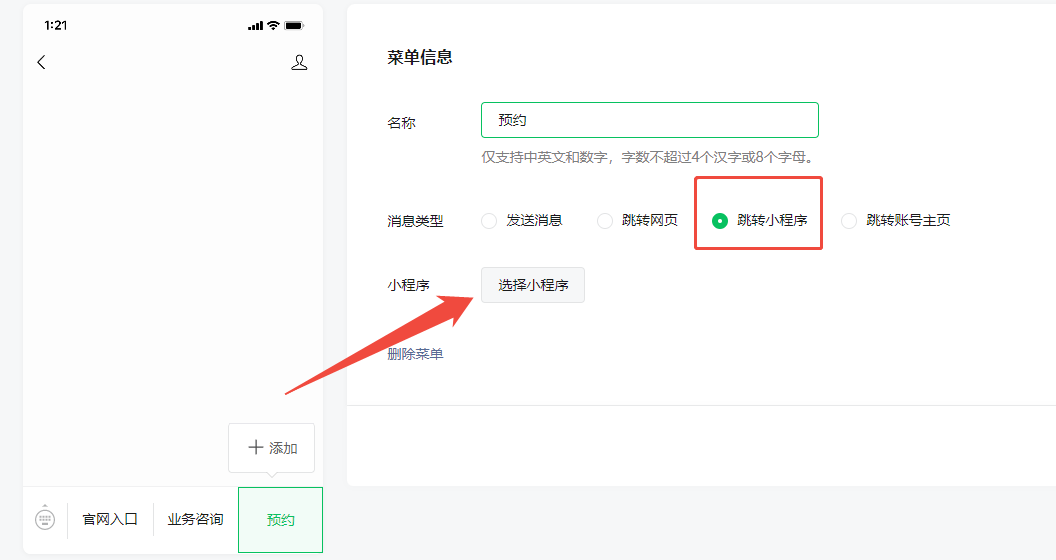 审核通过后,你的预约小程序就正式上线了!你可以把它绑定到公众号菜单,顾客就能通过公众号直接进入小程序进行预约了。