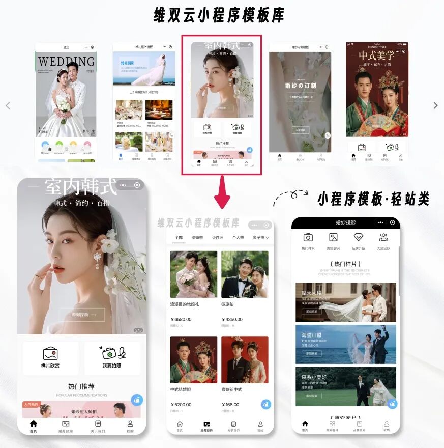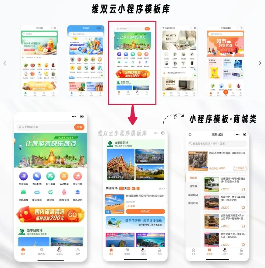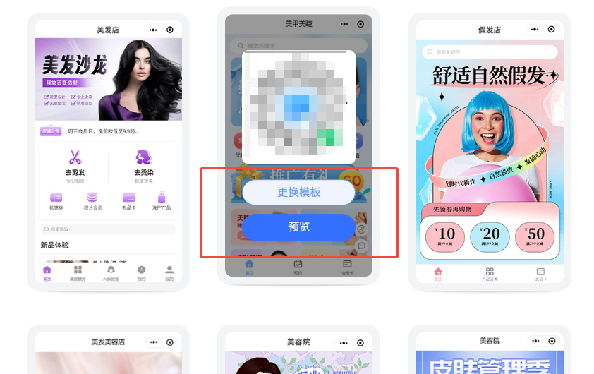 这是门店小程序的模板选择页面↓,其他类型的有自己的模板库,都是选中就能直接更换。