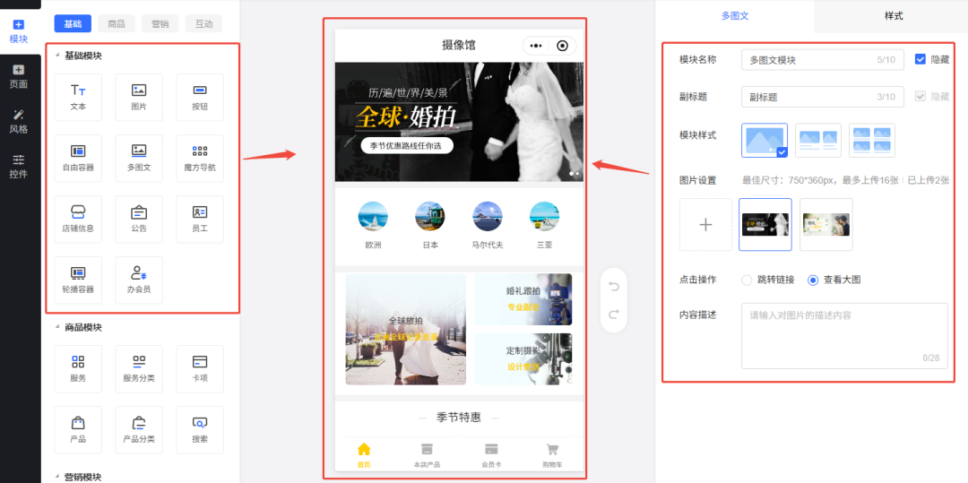 这是门店小程序的编辑页面↓,其他类型的也差不多,只是左边功能模块上会有差异