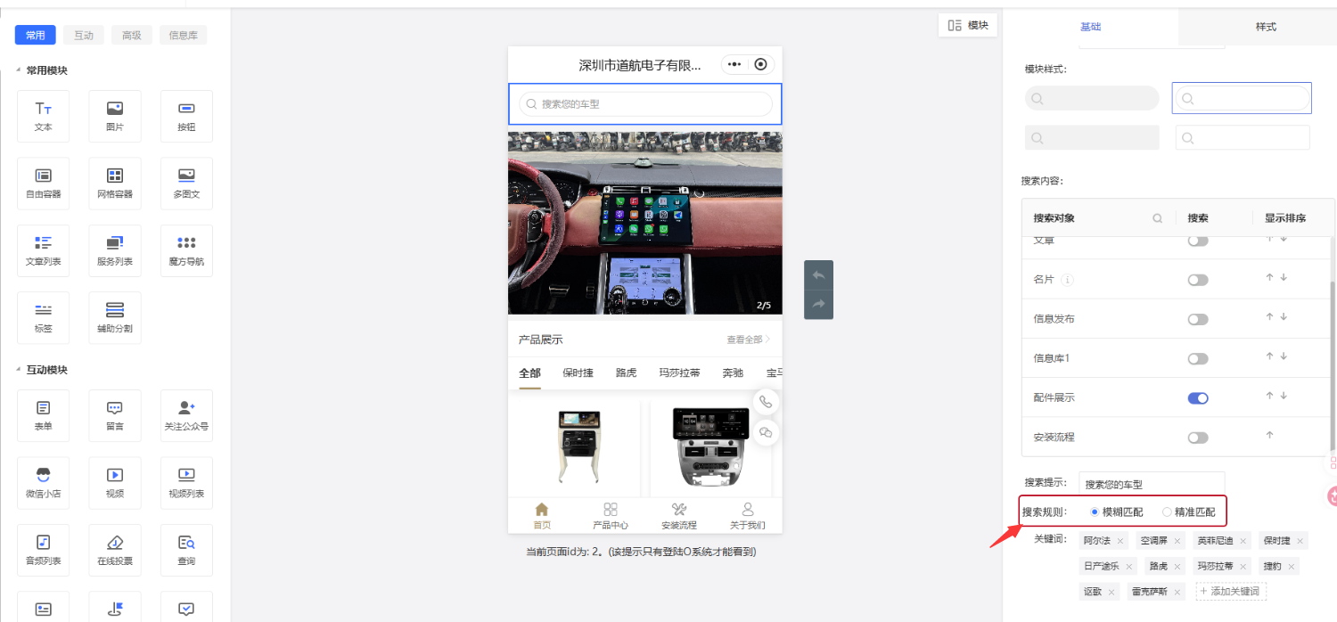 精准或者模糊搜索,不同的规则各有诉求群体,现开放给客户自行选择搜索组件新增设置“搜索规则”,客户自选关键词匹配规则: