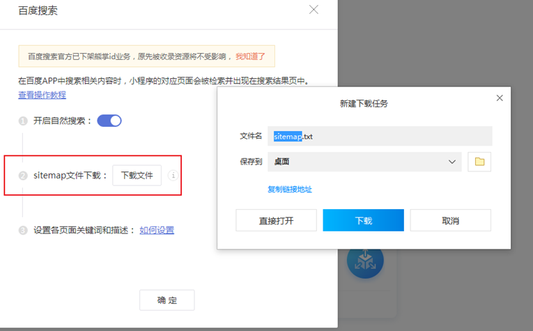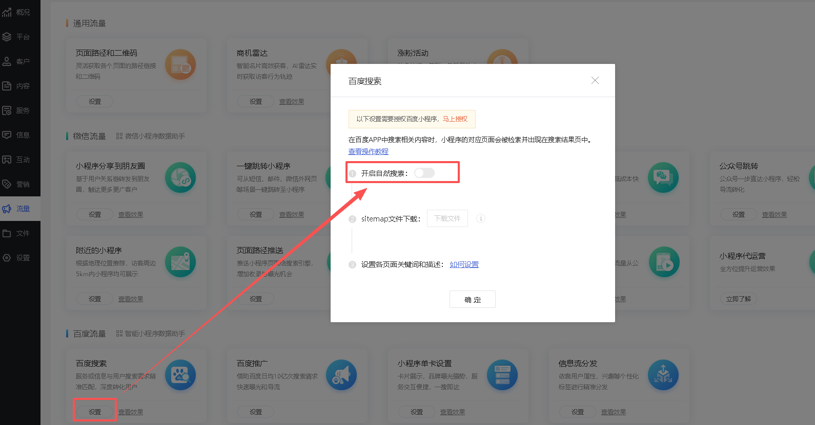 需要先开启自然搜索,也就是小程序web化,这样才能保证小程序可以像网页一样被正常收录、检索和搜索到。开启后,下载sitemap文件。sitemap文件也叫站点地图,可以更方便让百度了解您的小程序包括了哪些页面和内容。