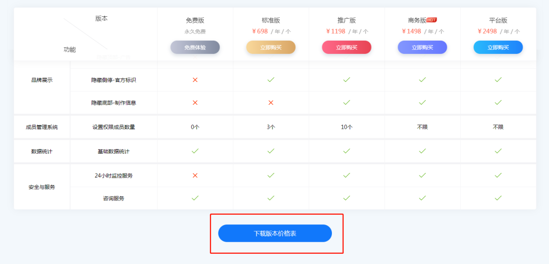 轻站官网版本功能对比列表底部,新增下载表格按钮,点击即可下载价格表