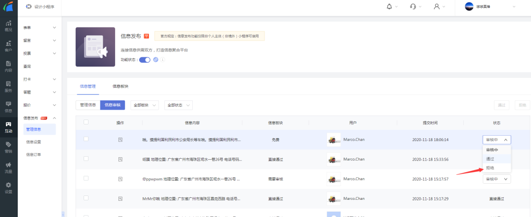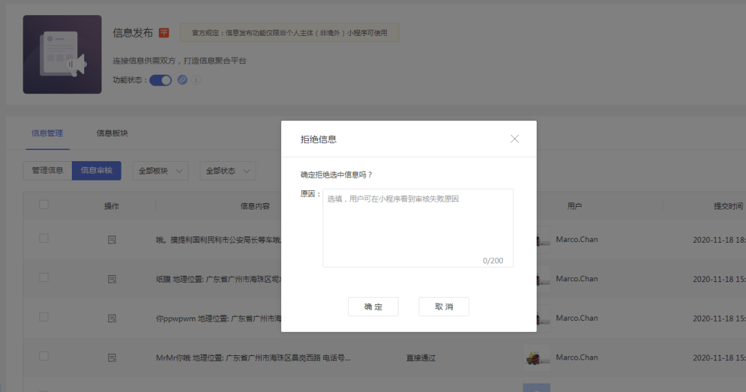 在信息发布管理信息页中,将某一条信息的状态修改为“拒绝”,在弹窗中输入即可输入拒绝的原因