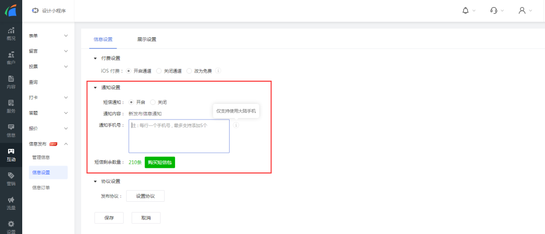 在轻站管理后台,通过【互动-信息设置-通知设置】路径,可开启管理员短信通知